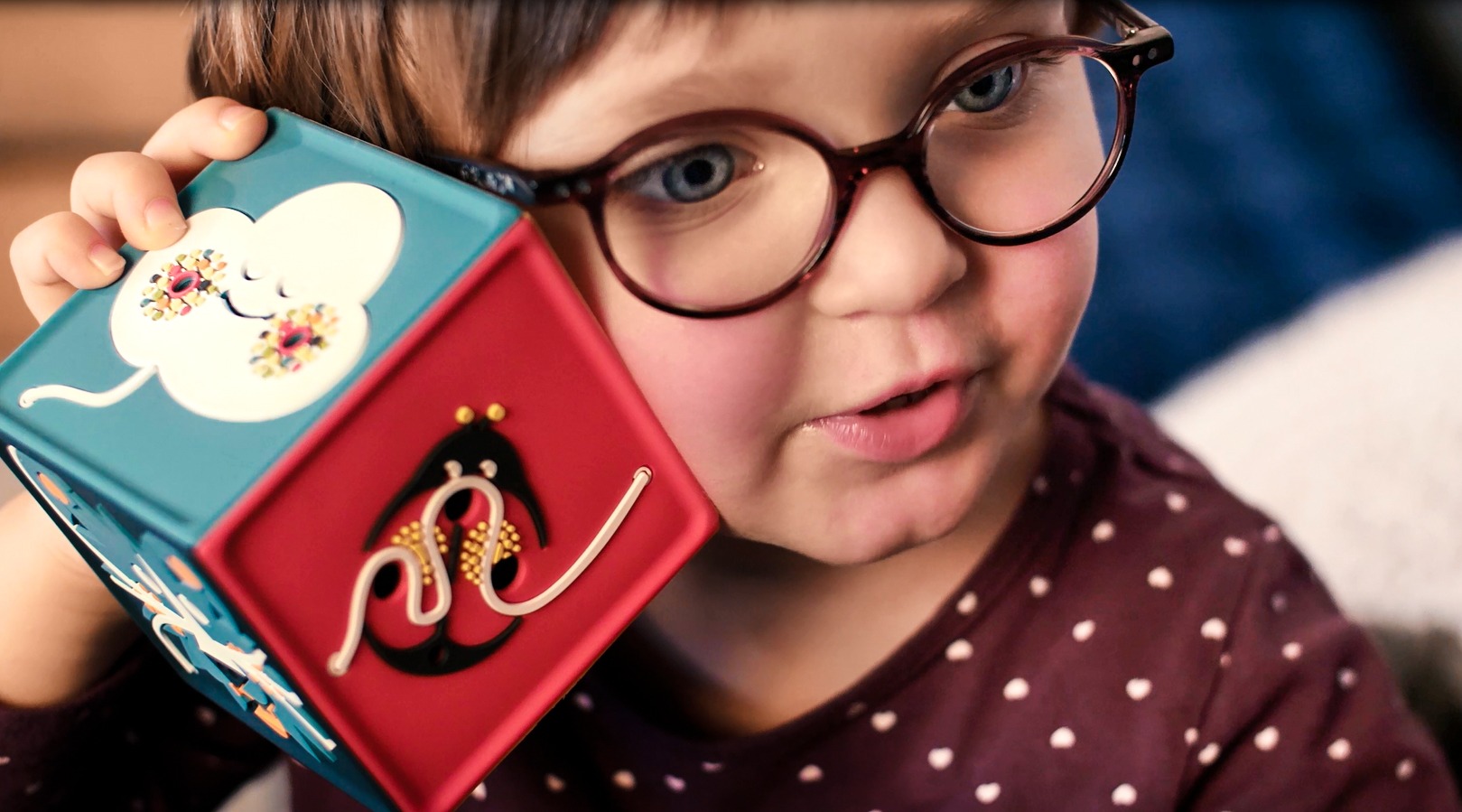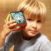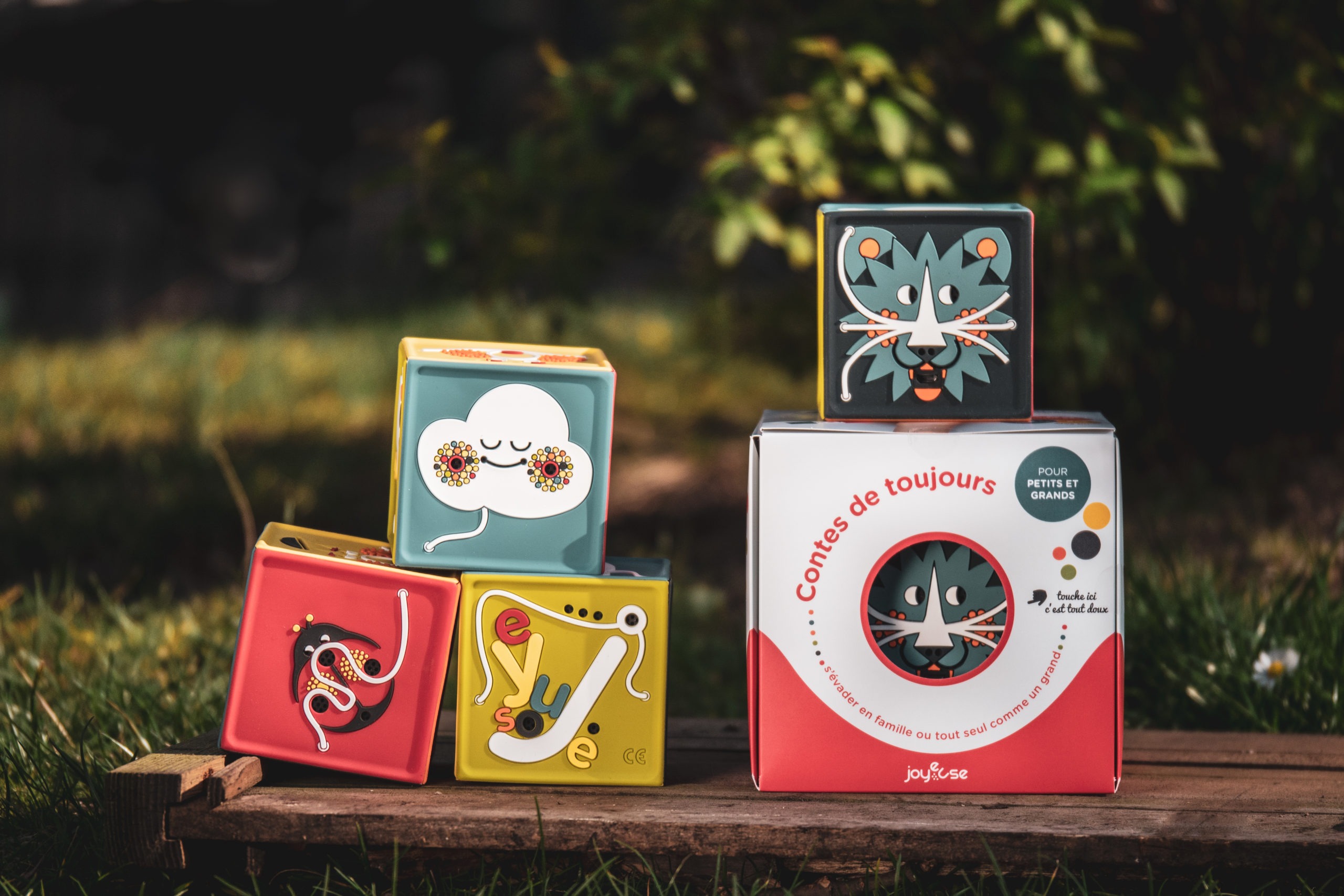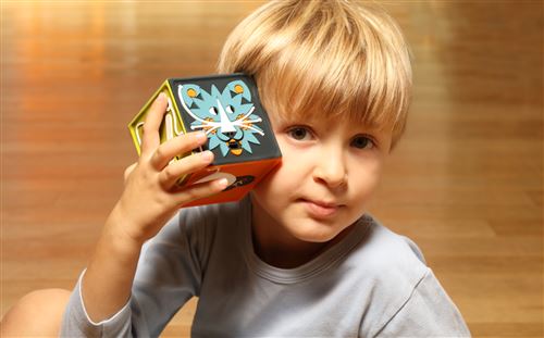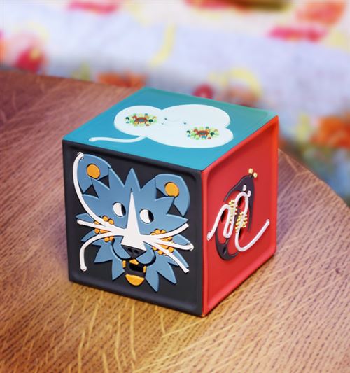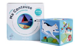 Un petit cube au look et au toucher irrésistibles, qui raconte une histoire ou chante une comptine quand on le secoue 3 fois.