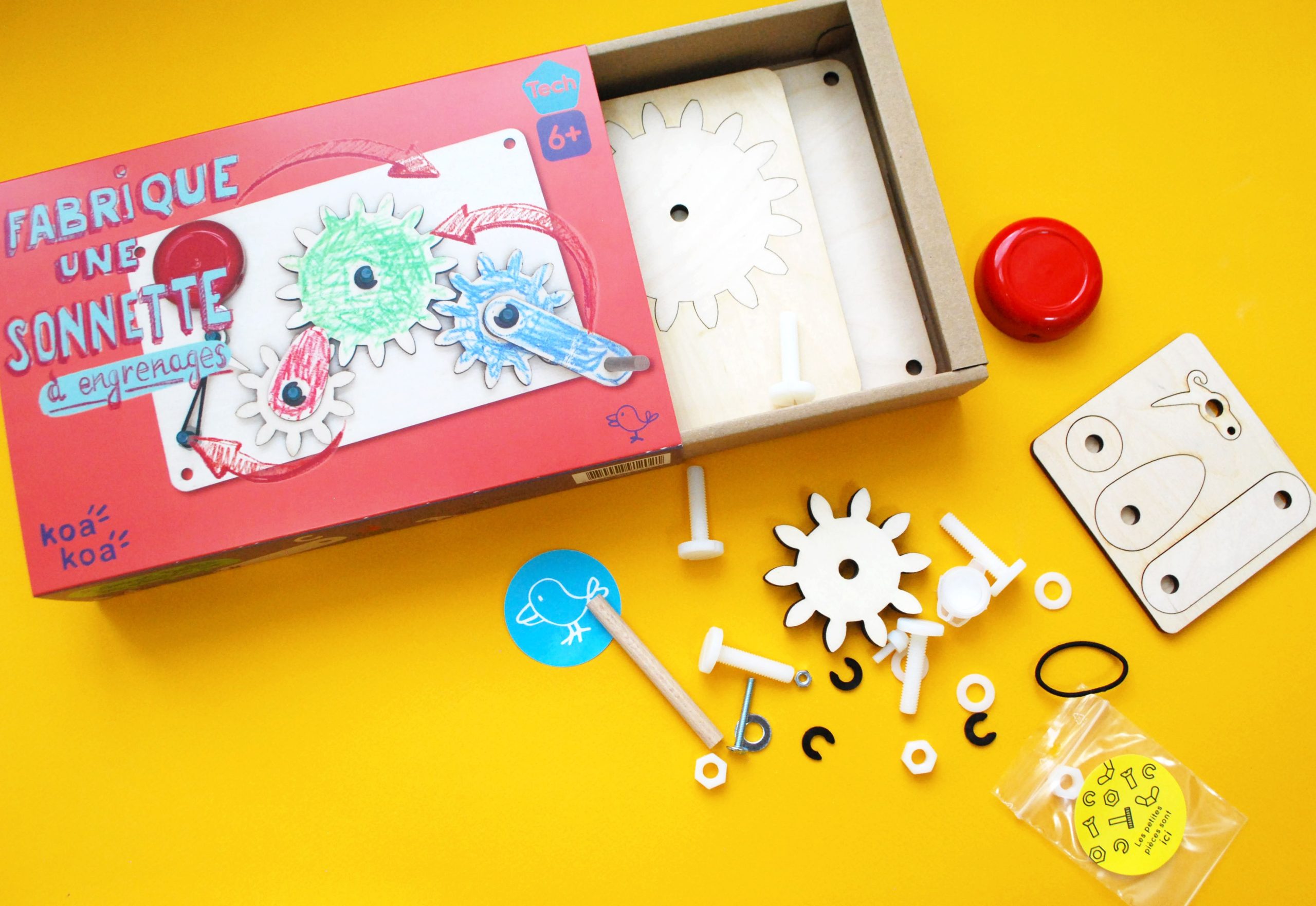 Ce kit contient tout ce qu’il faut pour construire une sonnette de porte pour ta chambre.