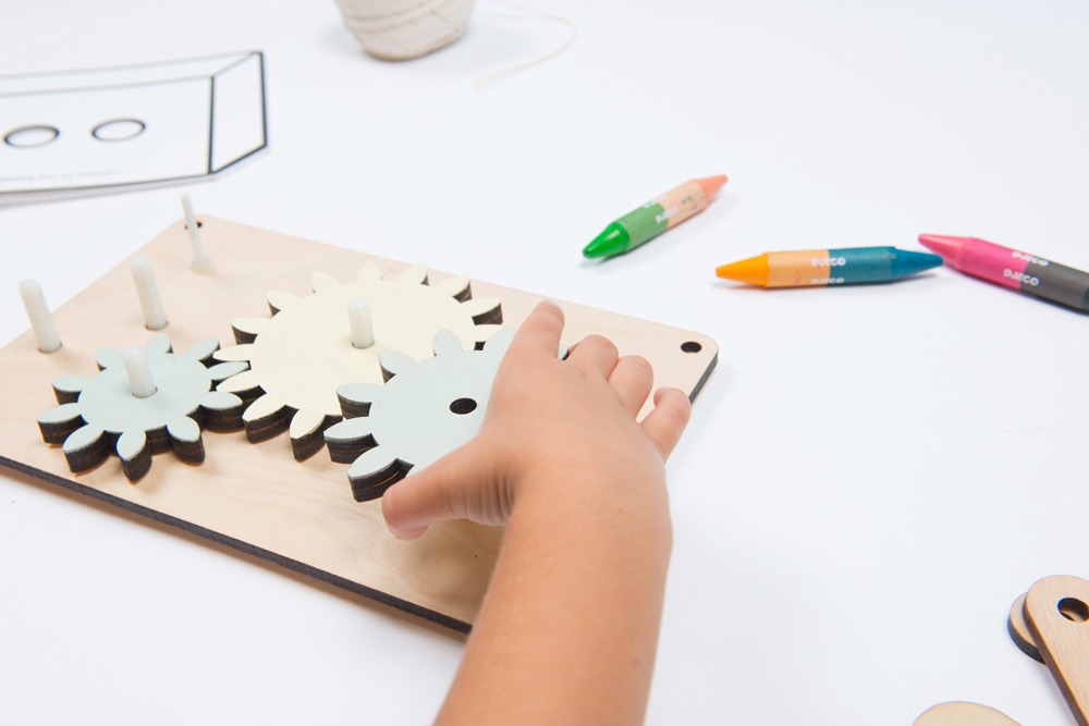 Une fois assemblée, tourne la manivelle: les engrenages enclenchent le marteau qui vient taper la sonnette. Décore la à ton goût.