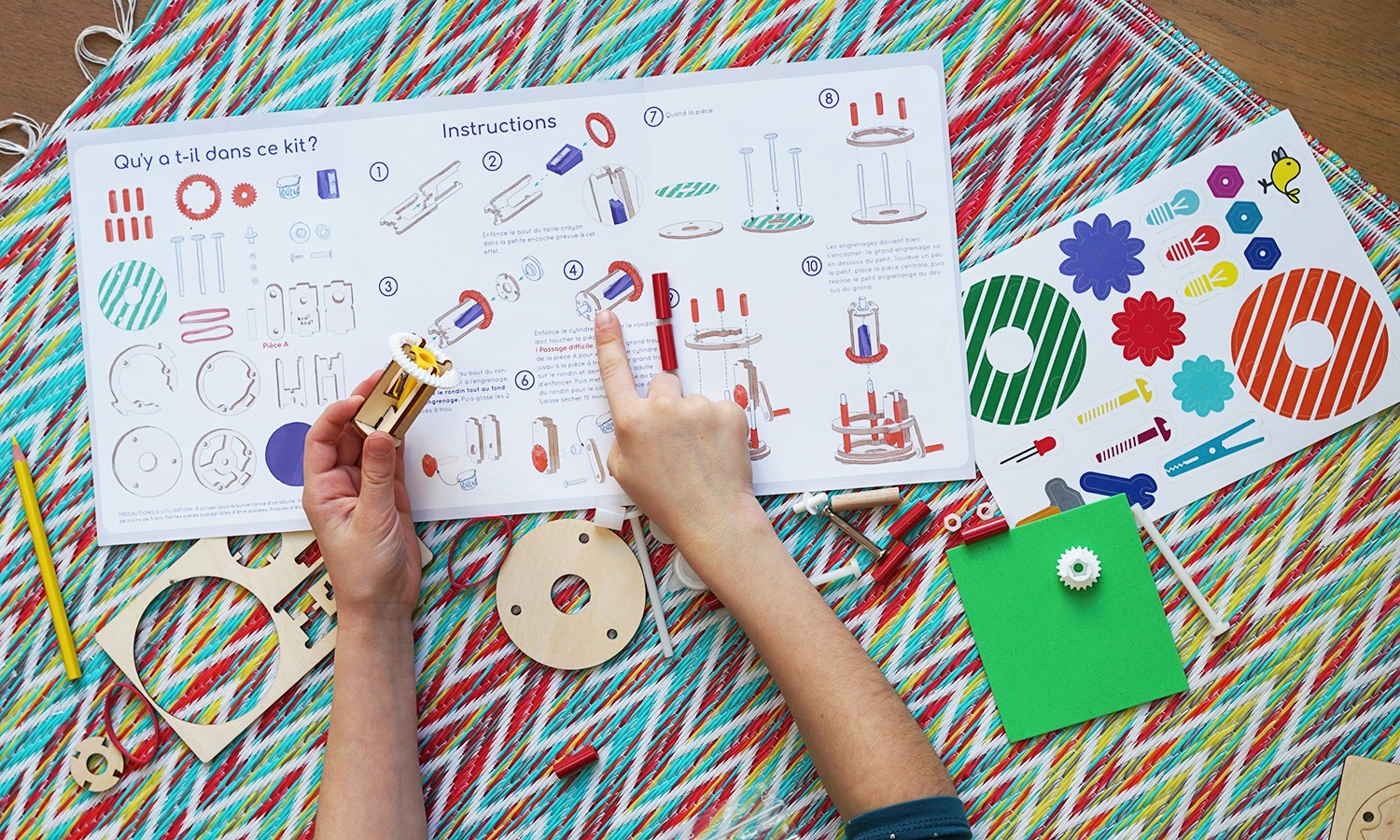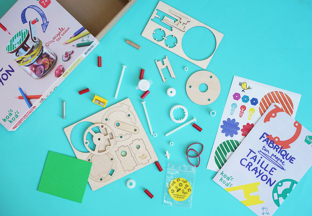 Assemble le taille crayon en utilisant : entretoises, boulons, vis, manivelle…et bien sur engrenages (tout est dans le coffret !).
