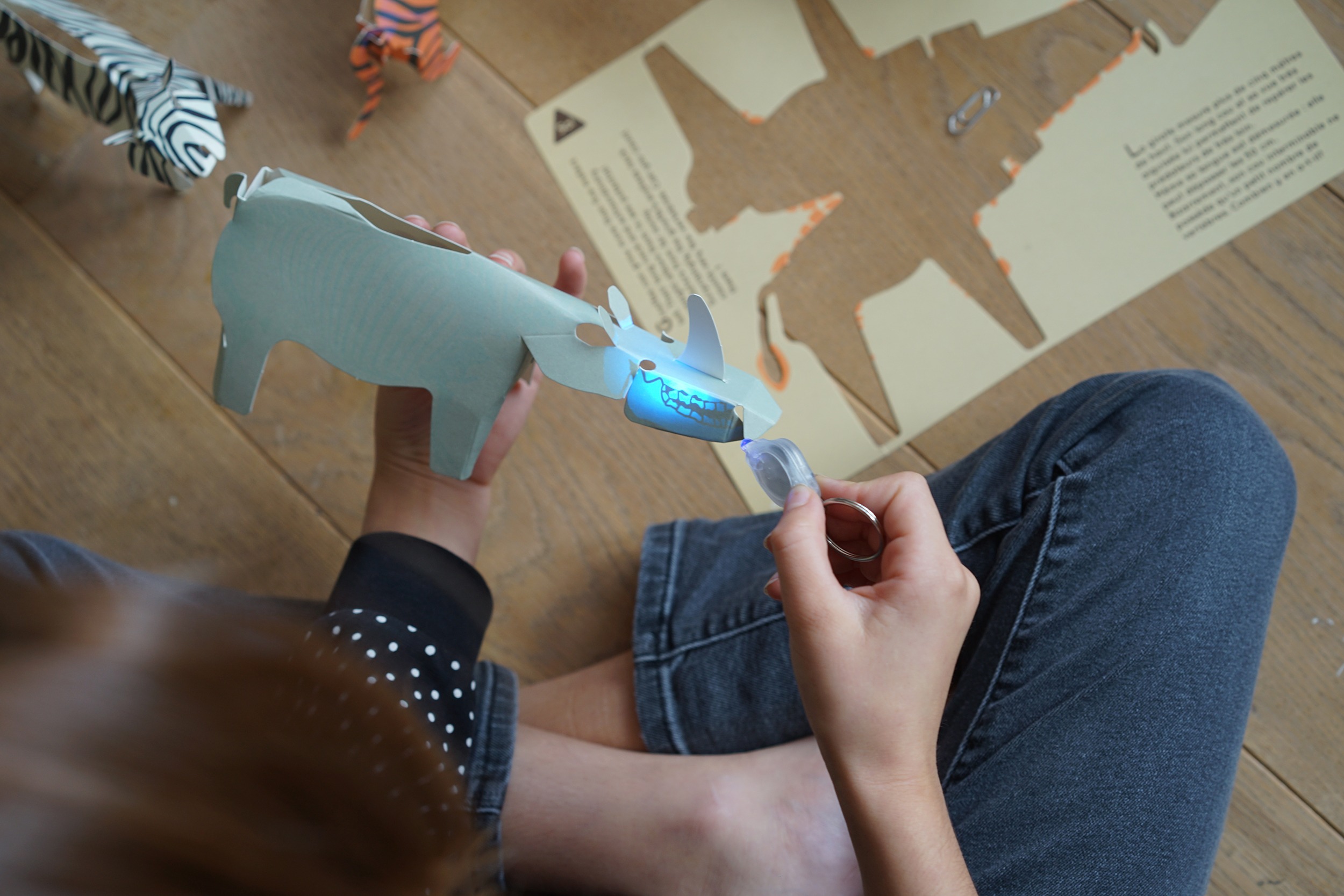 – Avec la lampe magique inclue dans le kit, éclaire les animaux: quelle surprises !