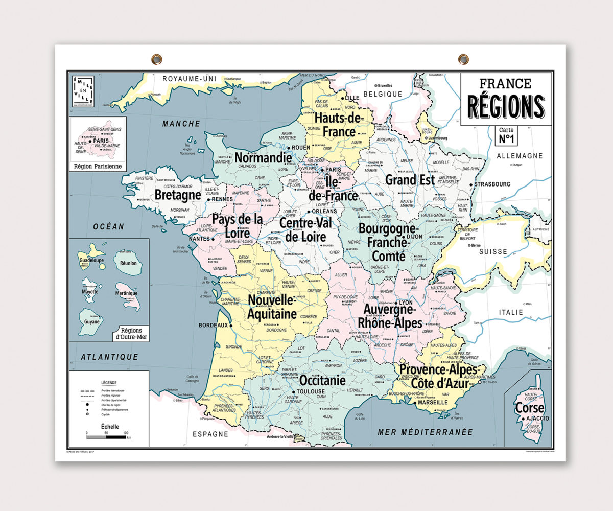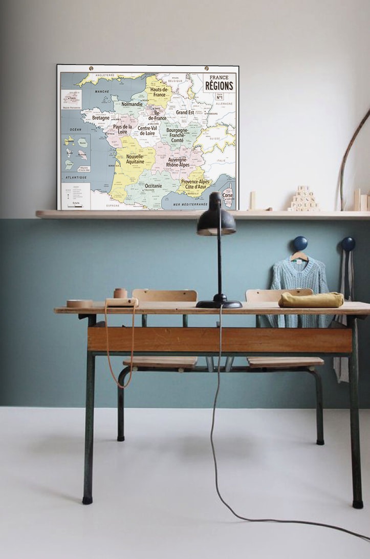 Une carte murale des 13 nouvelles régions françaises dans le style des cartes d’école de notre enfance.