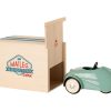 La souris est vendue habillée, avec son garage en bois certifié et sa voiture en métal bleue.