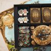 Contient : 64 cartes, 1 plateau de jeu, 1 table tournante, 4 bateaux, 32 jetons d’or, 32 jetons de marchandises, 32 jetons de pouvoirs magiques