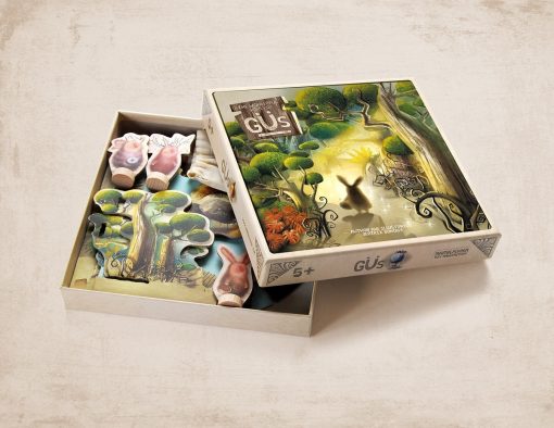 Contient : un plateau de jeu avec une forêt pivotante, 4 Güs, 1 Morc, 4 créatures de la forêt, 14 cartes Recette, 1 dé, 4 x 6 cristaux