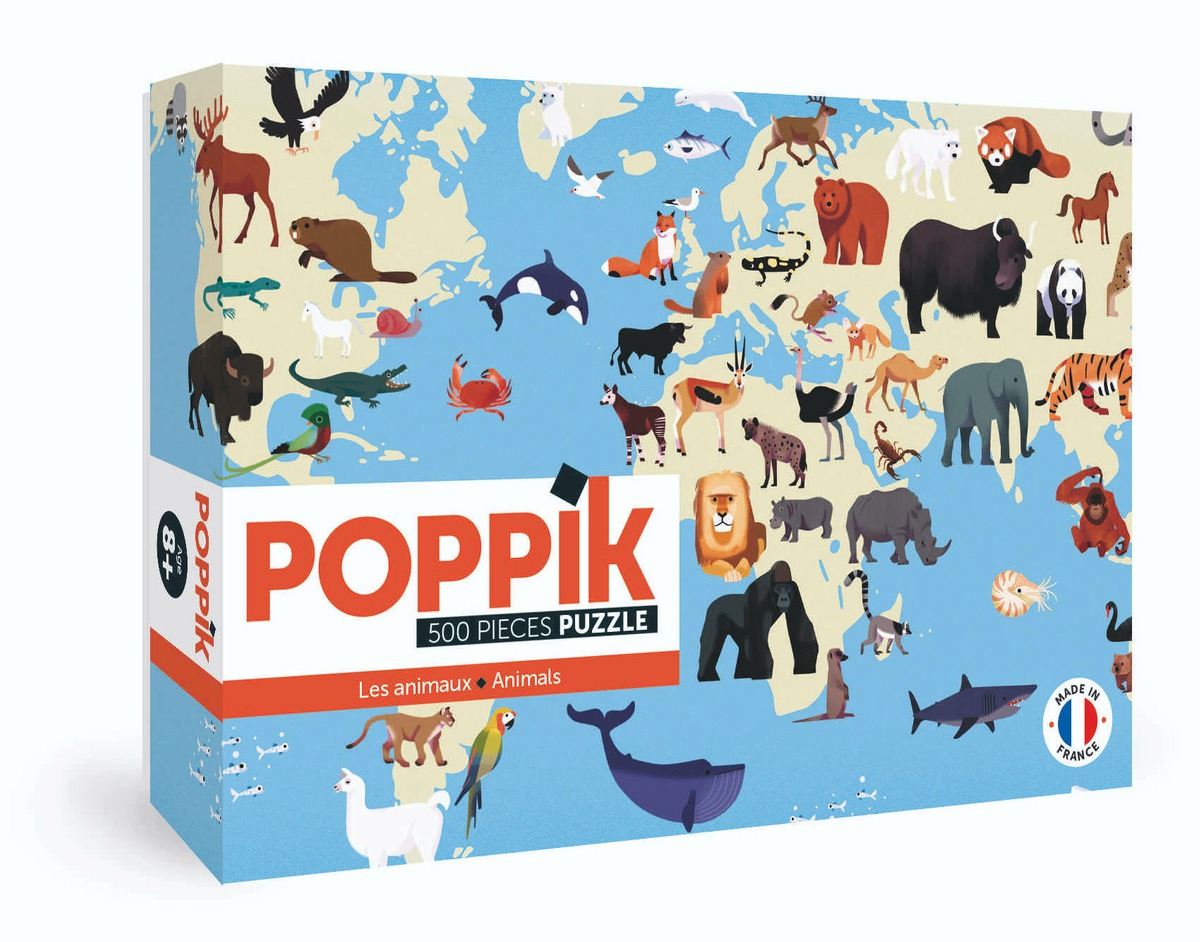 Sur une grande carte du monde, découvrez les animaux emblématiques de tous les continents : manchot, kangourou, bison, lama, panthère etc… Sur le poster éducatif fourni dans la boîte (au même format que le puzzle), retrouvez le noms de tous les animaux, en français et en anglais. Les plus jeunes enfants pourront participer : ils pourront replacer les pièces du puzzle directement sur le poster comme un jeu.