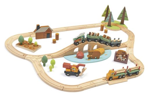 Un train de 3 wagons, son circuit de rails, ses buches magnétiques, un véhicule de transport de bois,