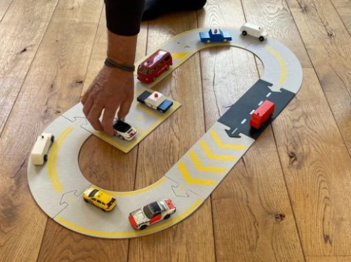 Le coffret circuit en carton recyclé est idéal pour laisser libre cours à l’imagination lors du jeu : vos enfants créent leurs propres circuits routiers pour leurs voitures et autres jouets favoris.