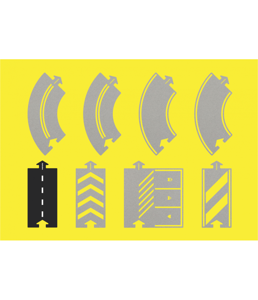– 4 courbes, 3 lignes droites (2 carton, 1 flexible) et 1 parking carré.